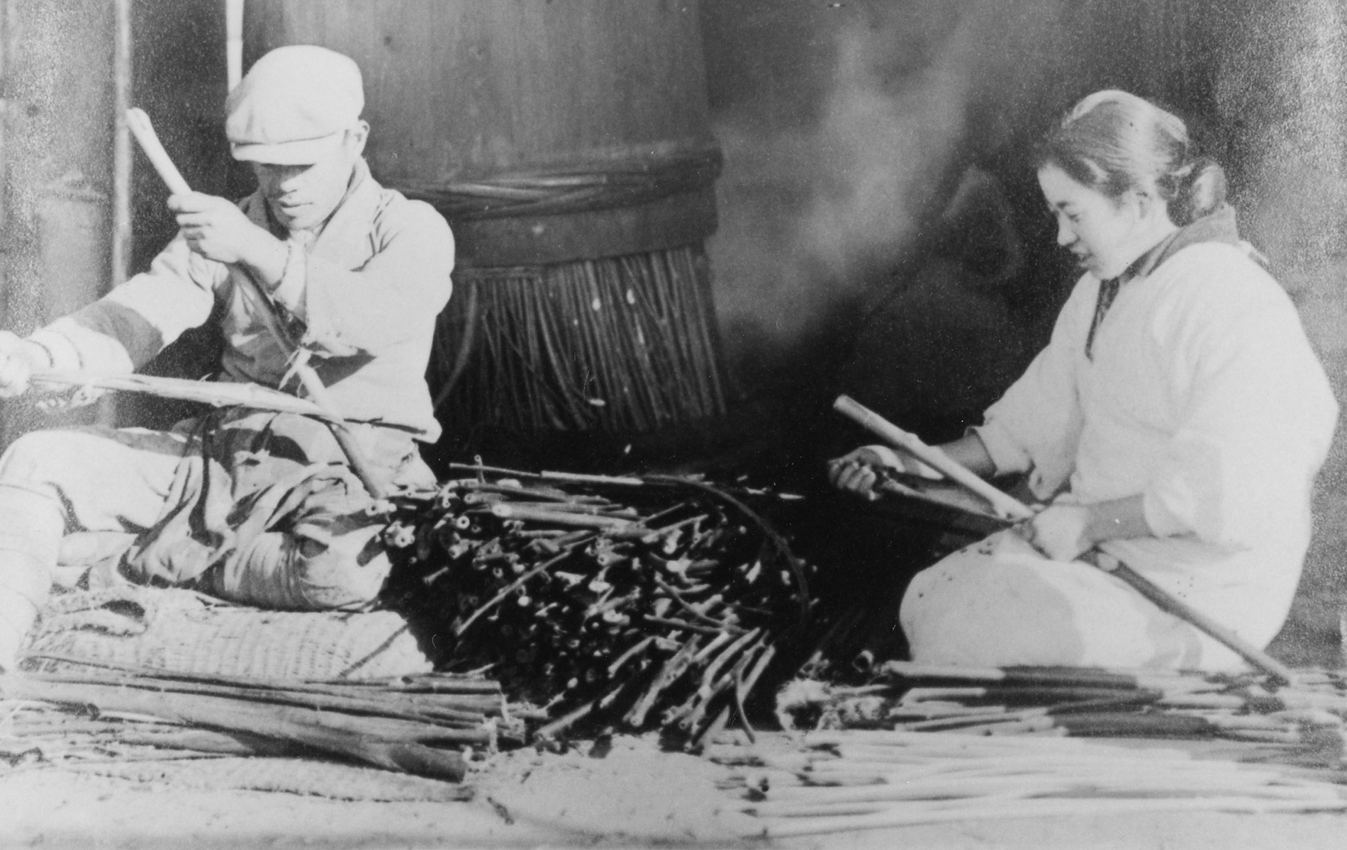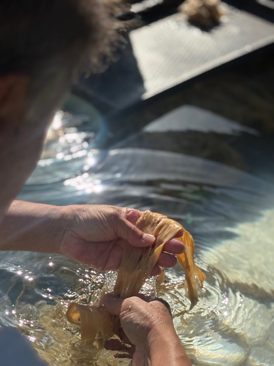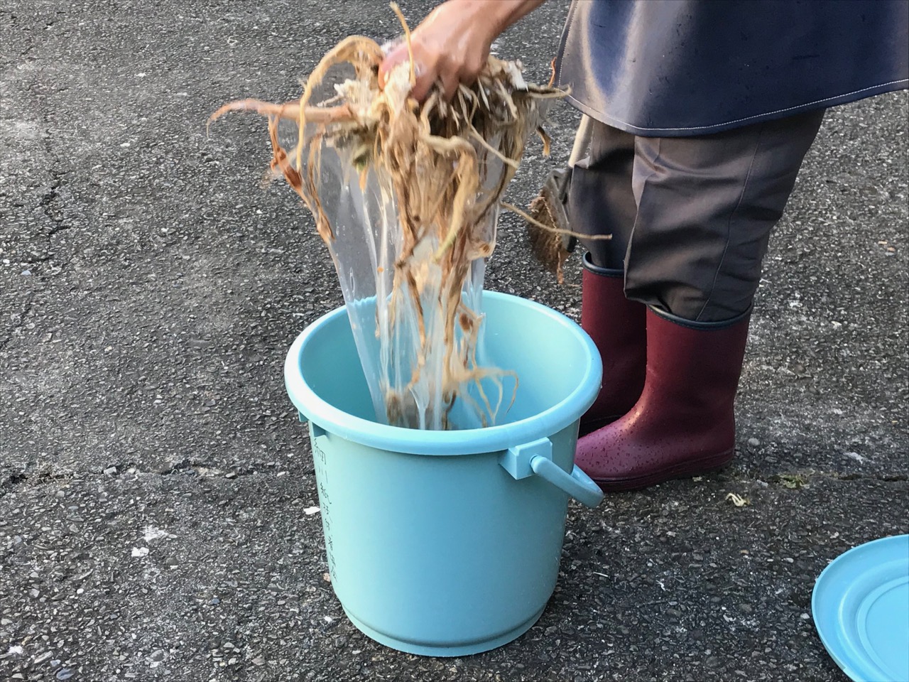 ⒎ちり取り | 湯きりした楮を流水に浸してアクを流しながら1本1本手作業でちりを取り除いていく作業です。数日かけて行うため、和紙づくりの工程の中では最も時間がかかりますが、綺麗な和紙を作るうえで欠かせない作業です。 |
