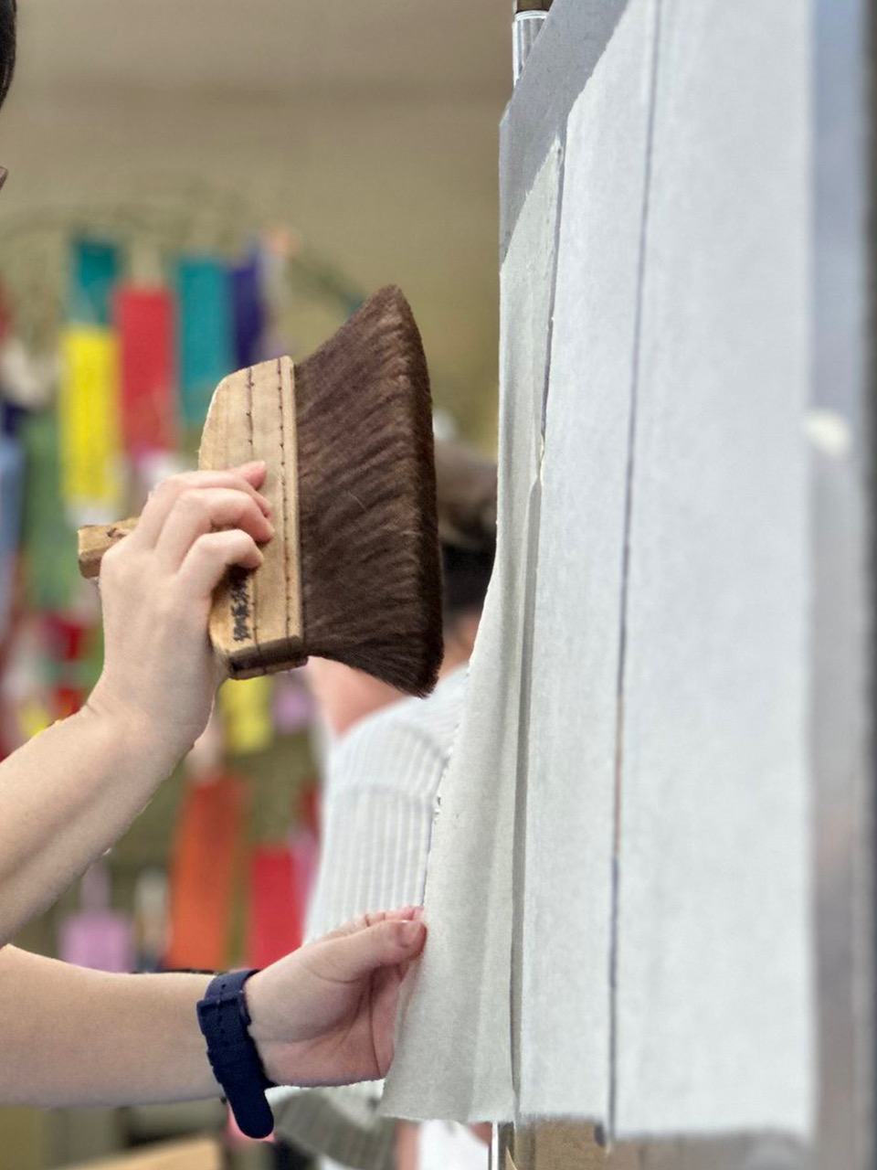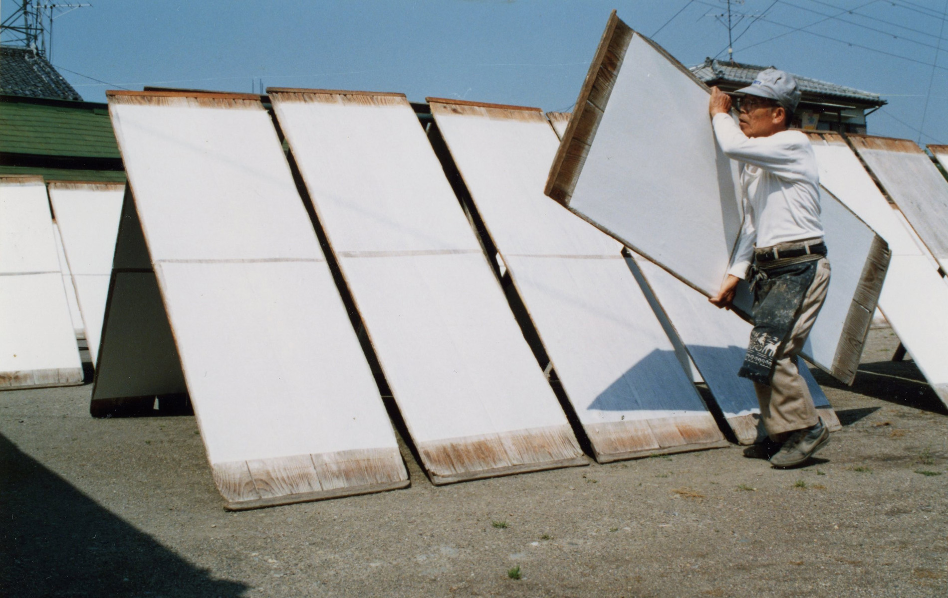 12.紙干し | かんだから和紙を1枚ずつ剥がして、乾燥機の鉄板に貼り付けて乾燥する作業です。乾燥が仕上がれば和紙の完成です。紙干しはかつて杉や銀杏などの板に貼り付けて天日で乾燥させていました。冬の乾燥した晴天の日には、千両にも値する和紙が乾くとされ、「ぴっかり千両」という言葉も生まれました。 |