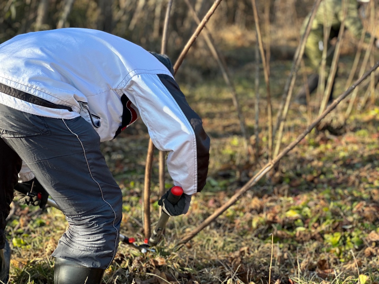 ⒉刈取り | 刈取り(かりとり)。楮の株元に鎌や鋏などの刃を当てて刈取ります。切り株の腐敗防止と保護のため、楮の切り口が南向きになるようにします。刈取り〜楮むきまでは一連の作業で、12月から1月頃に行います。 |