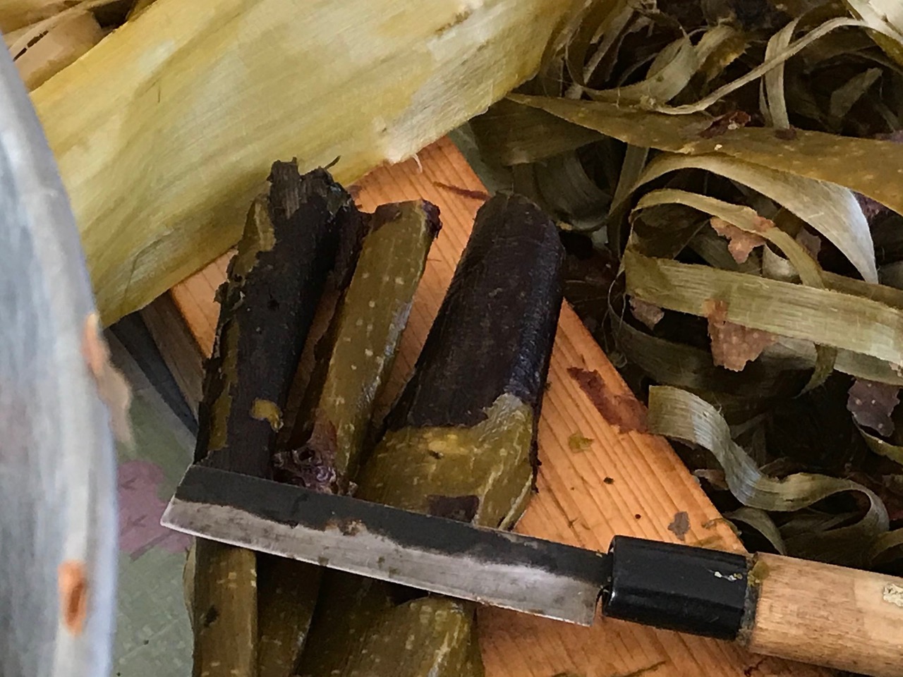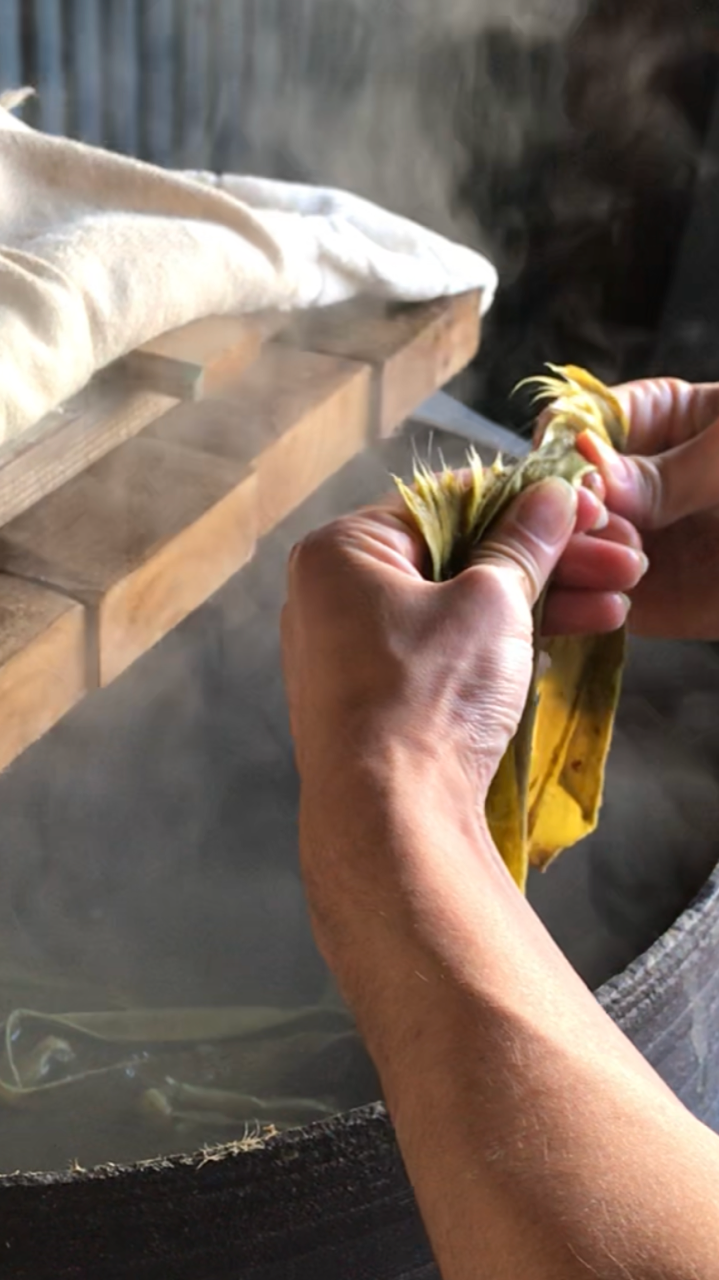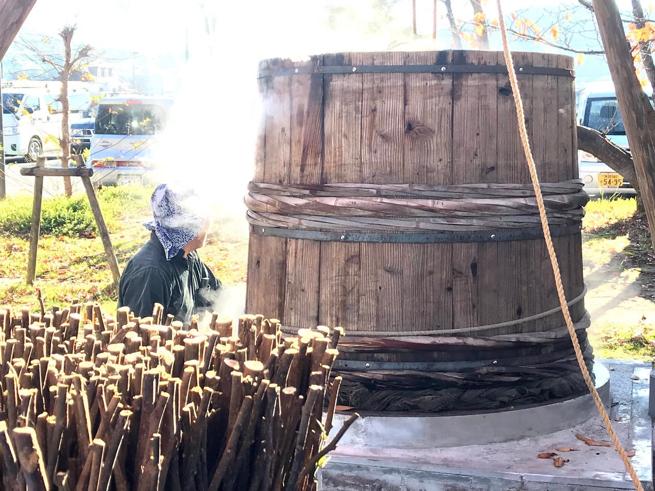 ⒊楮かしき | 楮かしき(かずかしき)。楮の樹皮を剥きやすくするために楮の原木を釜で蒸す作業です。まず、楮を約90cmに切り揃えて縄で束ねておきます。次に、底に水を張って網をかぶせた釜の中へモトを下にして楮の束を詰めていき、かしき桶や防水シートなどを被せて密封し2時間蒸します。蒸し上がった直後の楮に直接水をかけて外皮と芯を分離させて剥きやすくします。 |