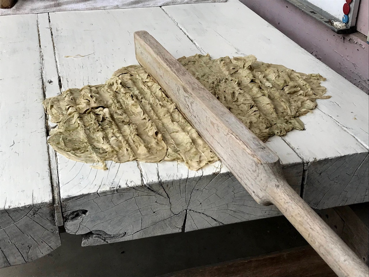 ⒏楮打ち | 楮打ち(かずうち)。木槌や打解機で叩いて楮の繊維をほぐす作業です。楮打ちした後、長刀ビーターで楮の繊維をさらに細かくして、和紙が漉ける状態(紙料)に仕上げていきます。 |