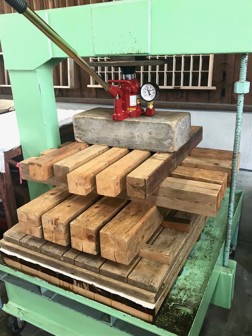 11.かんだしぼり | ジャッキを使いかんだを圧搾する作業です。一気に絞ると漉き重ねた和紙の層が押し出されたり切れてしまったりするため、時間をかけて少しずつ慎重に絞ります。 |