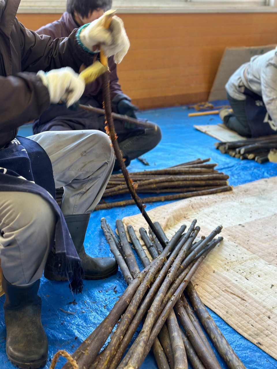 ⒋楮むき | 楮むき(かずむき)。蒸し上がった楮の樹皮を剥く作業です。冷えると樹皮を剥きにくくなるため、蒸し上がった直後に楮の束を保温シートで包み、ひと束ずつ取り出しては1本1本樹皮を剥いていきます。剥いた樹皮は3日ほど天日乾燥させ、干しあがったら束にして保存します。 |